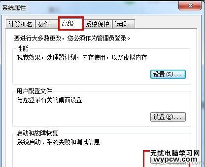 在打開的“系統屬性”窗口中,切換至“高級”選擇卡,然后點擊“系統和故障恢復 設置”按鈕。