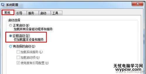 當然,我們也可以通過禁用某些開機項來嘗試修復系統。打開“運行”對話框,輸入命令“msconfig”進入“系統配置實用程序”界面,勾選“常規”選項卡下的“診斷啟動”選項。
