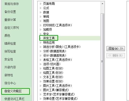 第四步、選擇【自定義功能區】,勾選【開發工具】選項卡;
