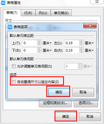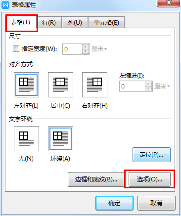 然后在表格屬性窗口中,在表格選項中,找到右下角的【選項】按鈕。