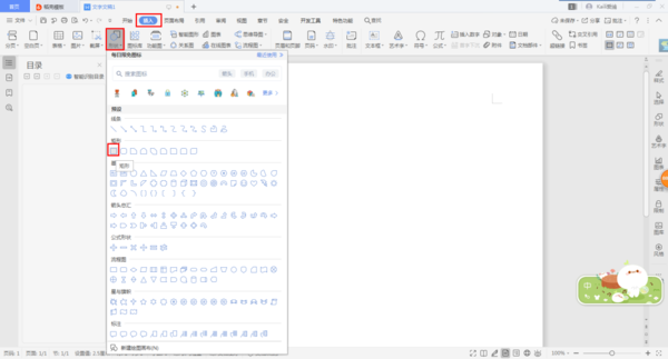 在Word的工具欄當中,選擇【插入】――【形狀】,然后在【矩形】一欄當中選擇【矩形】,然后在Word文檔當中,插入矩形。