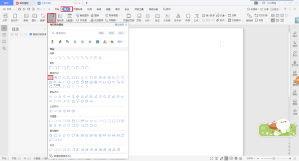 在Word文檔界面中,找到工具欄上的【插入】功能,然后找到【形狀】,在找到【基本形狀】下方的【文本框】。