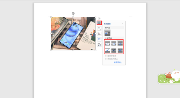 我們此時選擇【布局選項】功能,然后將圖片的布局格式調整為【非嵌入式】的布局,最后在將圖片移動到想要移動的位置上就可以了。