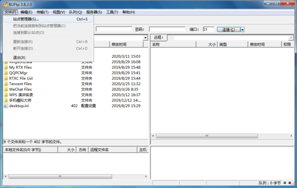 8UFTP軟件安裝成功后,打開軟件,我們可以看到軟件的界面被劃分成了四個區域,包括本地電腦分區、遠程的FTP空間,上傳下載文件狀態以及FTP連接的狀態。