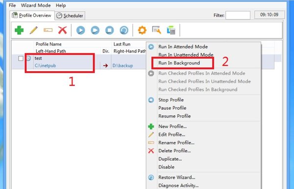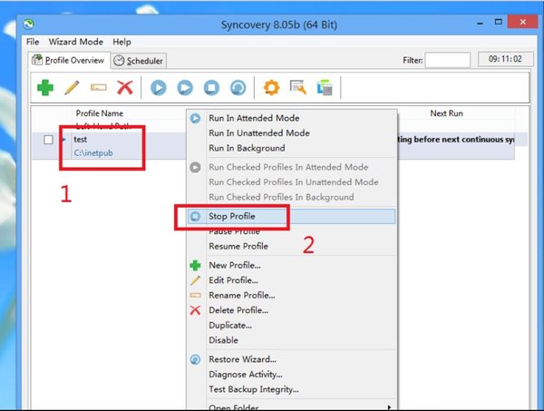 而如果此時我們想要人工來干預的停止備份的循環(huán)的話,我們就可以在Sheduler上右鍵,然后在右鍵的菜單中選擇【Stop Profile】選項,此時狀態(tài)欄上的信息就會顯示為【Scheduler OFF】,循環(huán)備份就停止了。