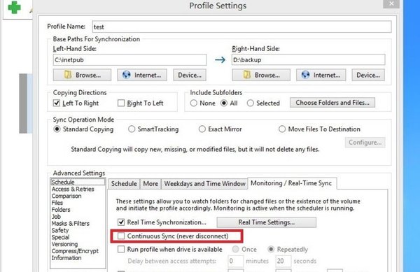 最后,需要進行說明的是,如果此時我們不想讓軟件進行實時的自動備份的話,我們只需要在【Schedule】目錄里的【Monitoring/Real Time Sync】選項中,不勾選【Continues Sync】選項就可以了。