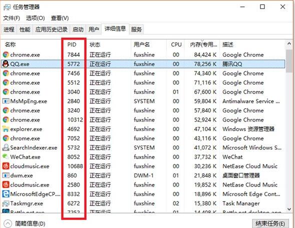 先在任務管理器中,轉到“詳細信息”一欄,查看下你想關閉程序的”PID“(程序進程編號)是什么!