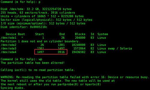 使用fdisk工具先刪除/dev/sda4分區,然后創建新分區,注意開始的磁柱號要和原來的一致(是保證數據不丟失的關鍵步驟),結束的磁柱號默認回車使用全部磁盤。