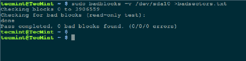 sudo badblocks -v /dev/sda10 > badsectors.txt