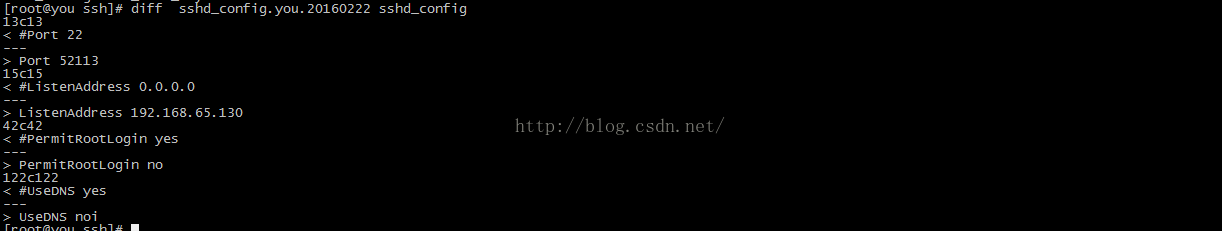 b.通過sed命令進行批量修改:sed -ir '13 iport 52113/nPermitRootLogin no/nPermitEmptyPasswds no/nUseDNS no/nGSSAPIAuthentication no' sshd_config