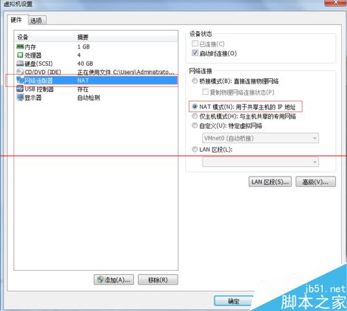 通過'虛擬機'->'設(shè)置'或者ctrl+D打開虛擬機設(shè)置,查看網(wǎng)絡(luò)適配器設(shè)置中網(wǎng)絡(luò)連接方式設(shè)置;這里我選擇NAt方式連接;
