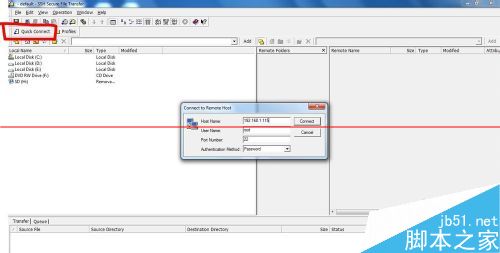3、點擊“Quick Connect”按鈕,按照圖示分別輸入剛才的IP地址,root用戶名,并選擇“Password”進行設置連接。