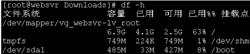 4、回到命令行模式用“df -h”命令檢查一下,可以看到根分區增大至6.9G了。動態擴展無需重啟,立即生效,大功告成!
