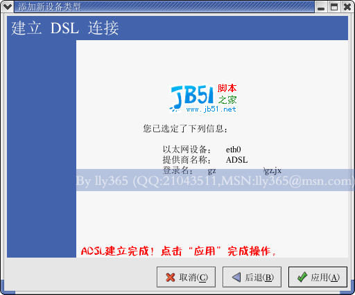 第四步,完全ADSL連接的建立。此時,已經完成了ADSL的建立。系統會出現一個對話框,上面列示了您在上一步配置里選擇/填寫的參數(口令除外)。