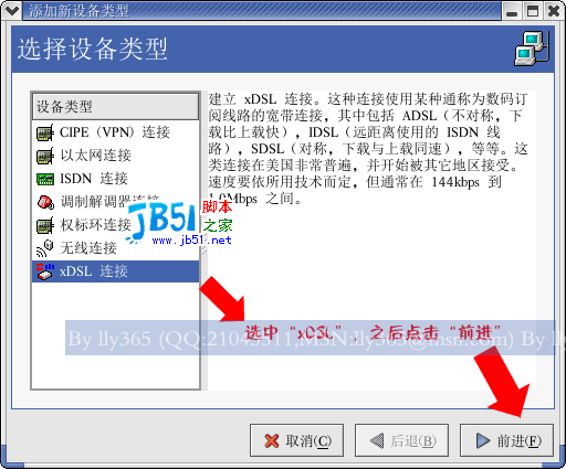 第二步,建立ADSL連接。上一步單擊“新建”后,會出現一個“添加新設備類型”的對話框,里面列示了7種類型的連接。我們選擇最后一種,即“xDSL連接”。選中該項后,點擊“前進”。