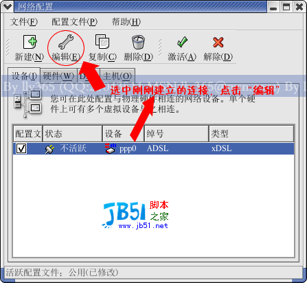 第五步,建立好ADSL后,會返回到“網絡配置”界面。選擇剛剛建立好的連接,并點擊“編輯”按鈕。