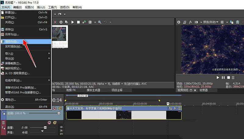 完成音頻波形圖組件的刪除,選擇"文件"->"渲染為"菜單,可將音頻去除剪輯處理后的無聲視頻導(dǎo)出到電腦上。