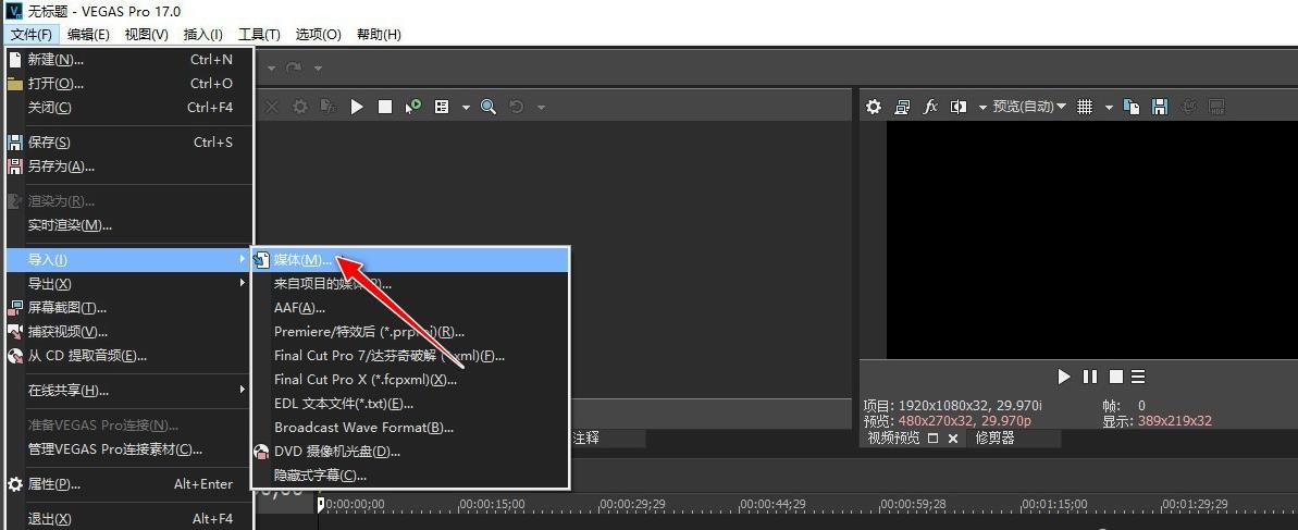 打開軟件操作的主界面,選擇"文件"->"導(dǎo)入"->"媒體"菜單。