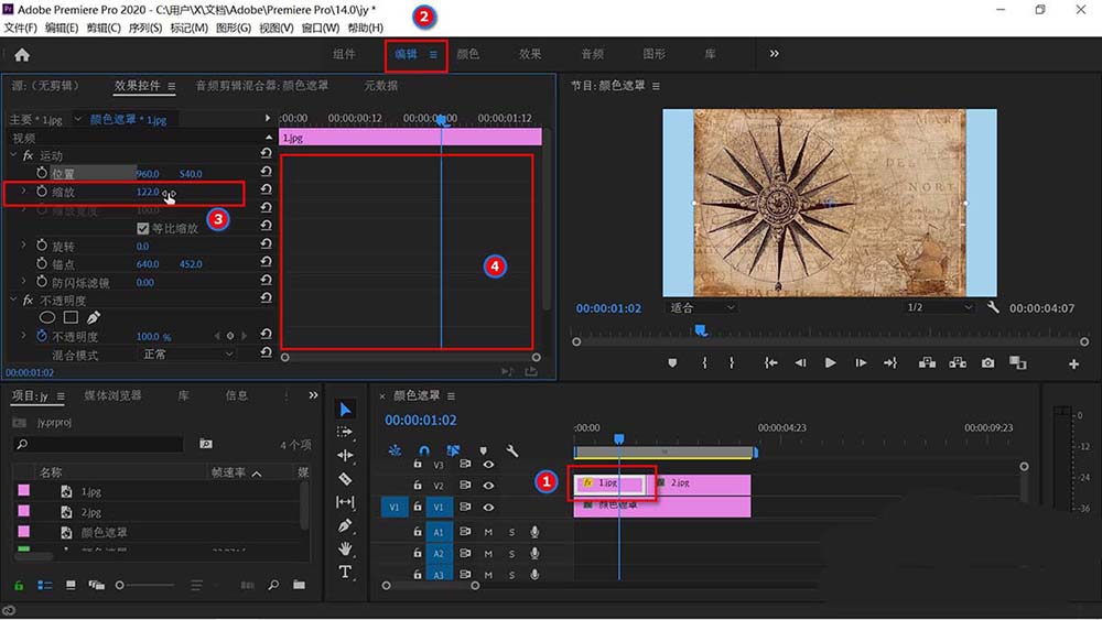 5、鼠標左鍵點擊選中第一段素材后移動到上部工具欄,依次點擊“編輯”,“效果控件”,“運動”,找到下方的“縮放”,鼠標點擊右邊的數(shù)字不放左右拖動改變數(shù)字大小,同時觀察右邊視頻預(yù)覽區(qū)的畫面大小,調(diào)節(jié)到合適位置后釋放鼠標左鍵??梢钥吹剑?rdquo;運動“右邊的小窗口沒有顯示關(guān)鍵幀。