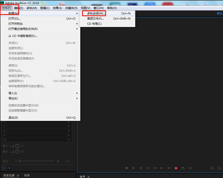 首先在電腦中打開AU軟件,點擊頂部工具欄中的“文件”——“新建”——“多軌會話”。