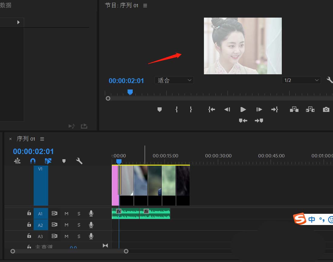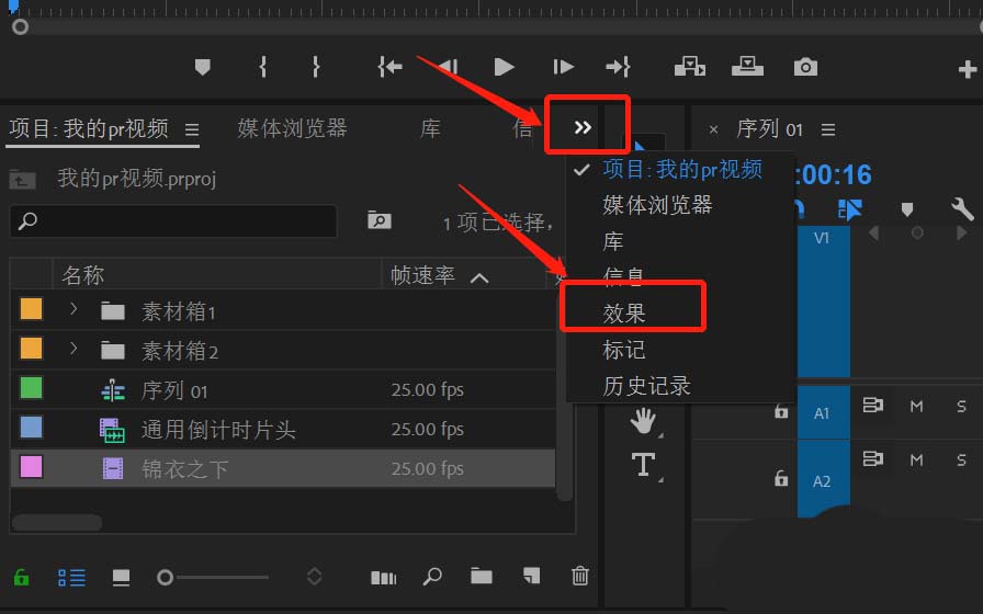 4、點擊項目窗口的雙箭頭圖標。點擊“效果”調出效果控件。