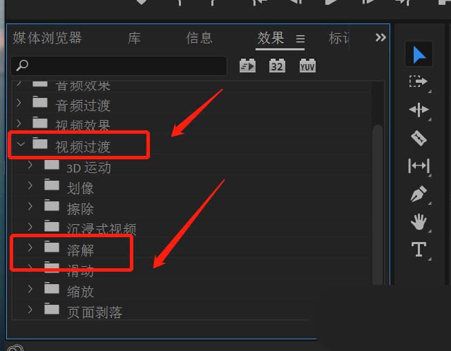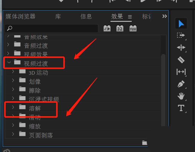 5、雙擊“視頻過渡”,找到“溶解”,然后雙擊。