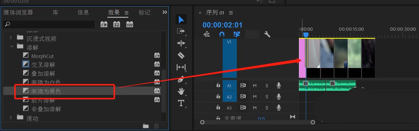 6、找到“漸隱為黑色”,用鼠標拖動“漸隱為黑色”到視頻軌道所選的時間點上。