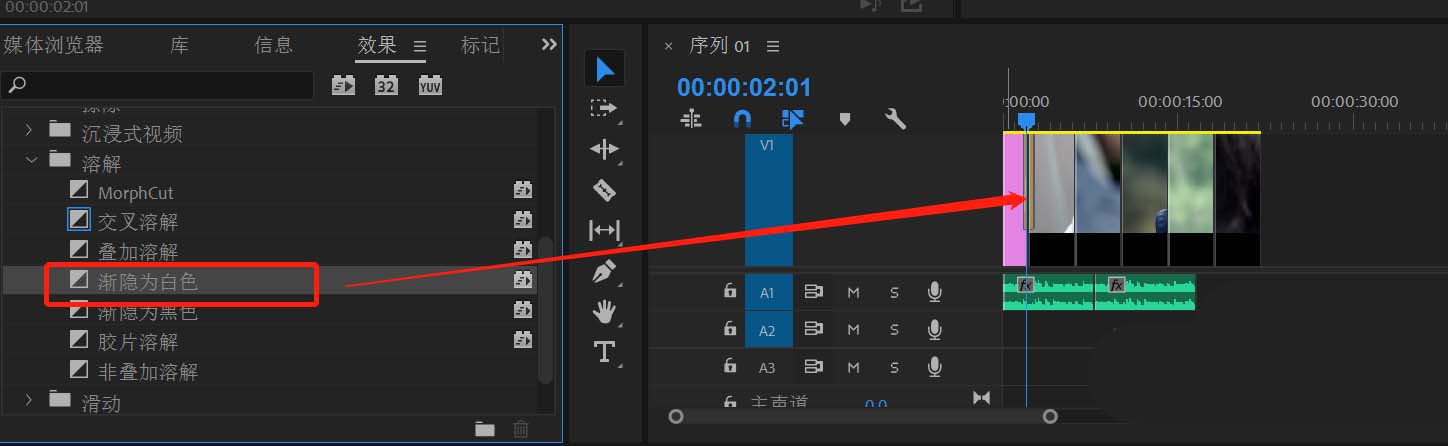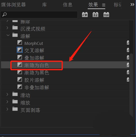 6、找到“漸隱為白色”,用鼠標拖動“漸隱為白色”到視頻軌道所選的時間點上。