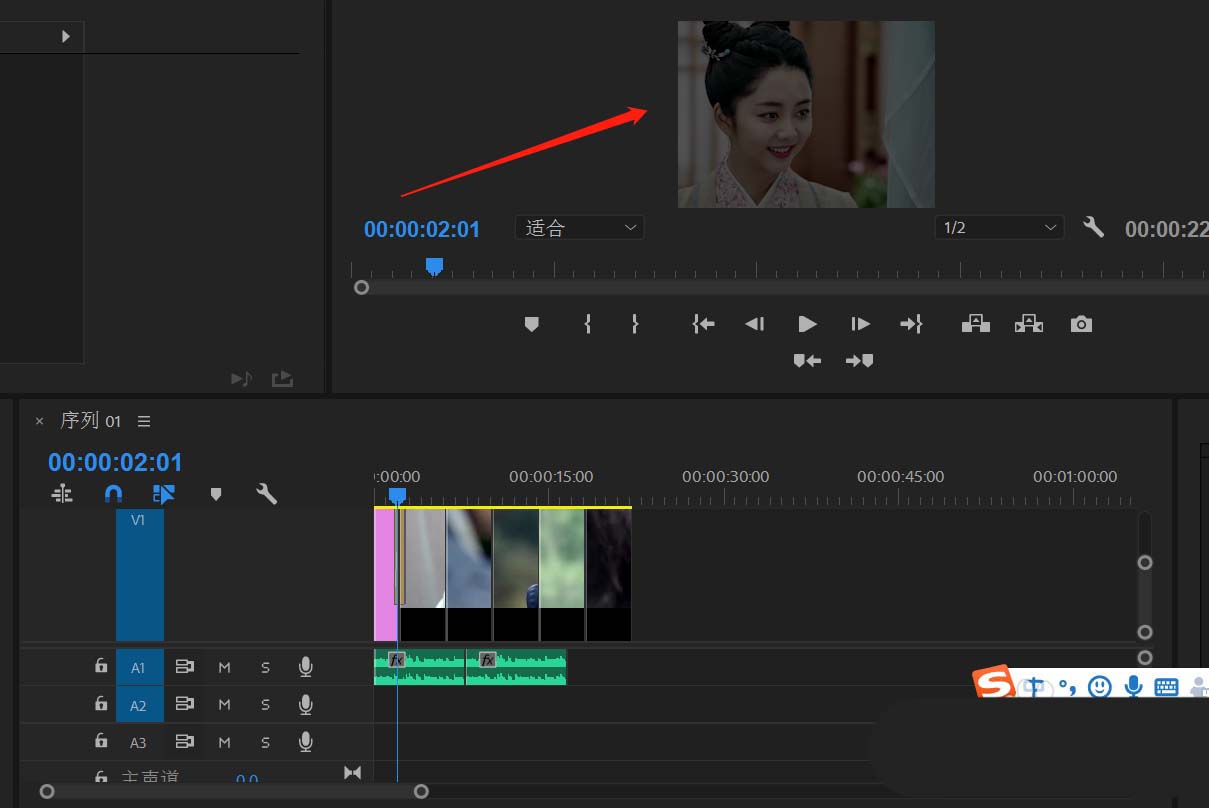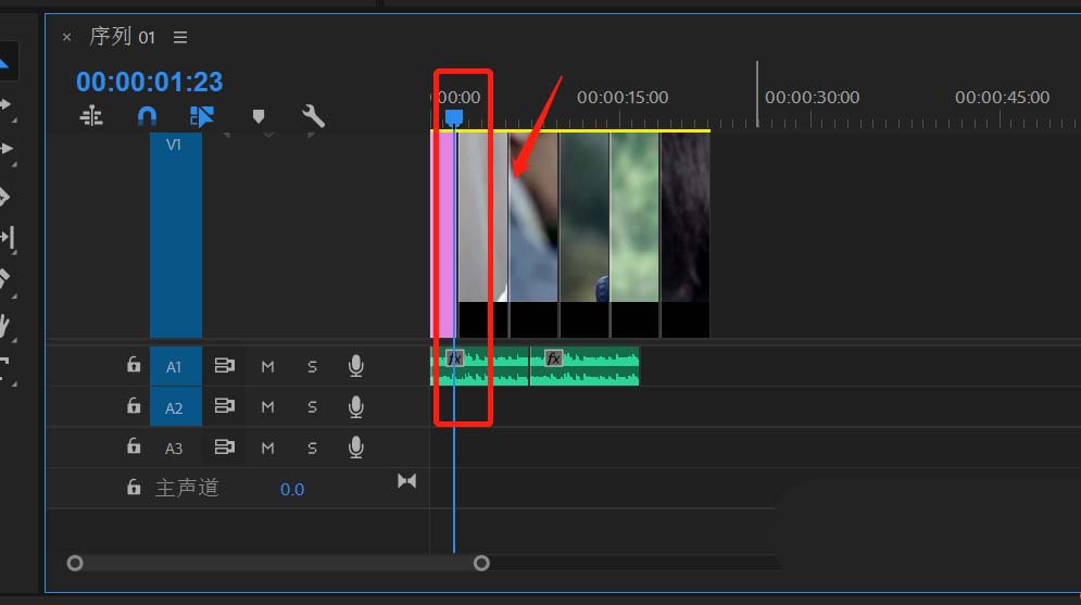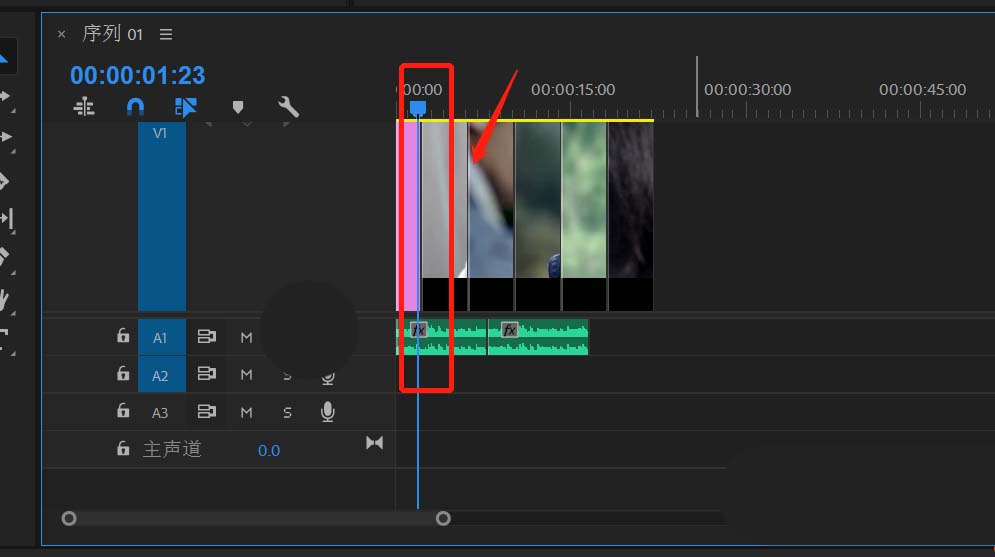 3、在視頻軌道上選擇需要轉場過渡的時間節點。