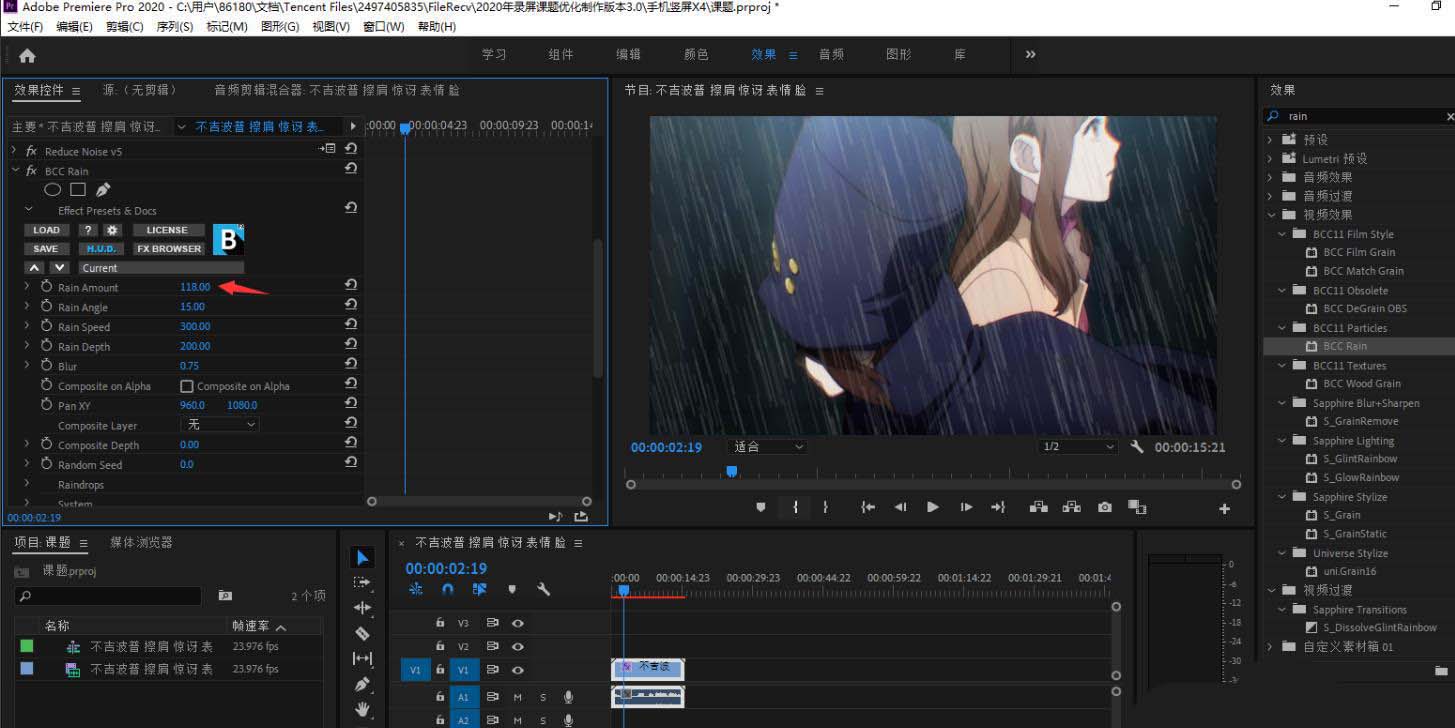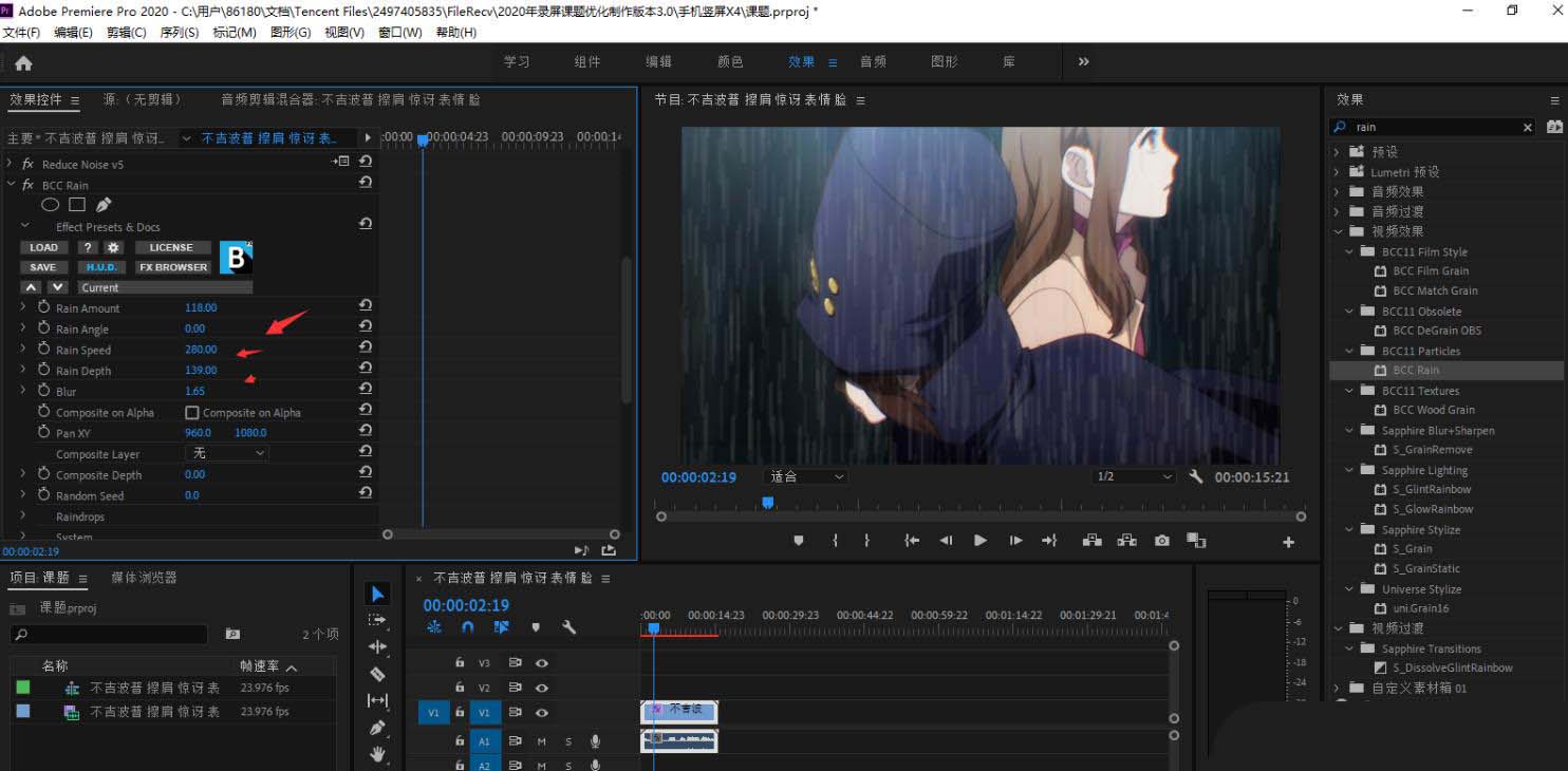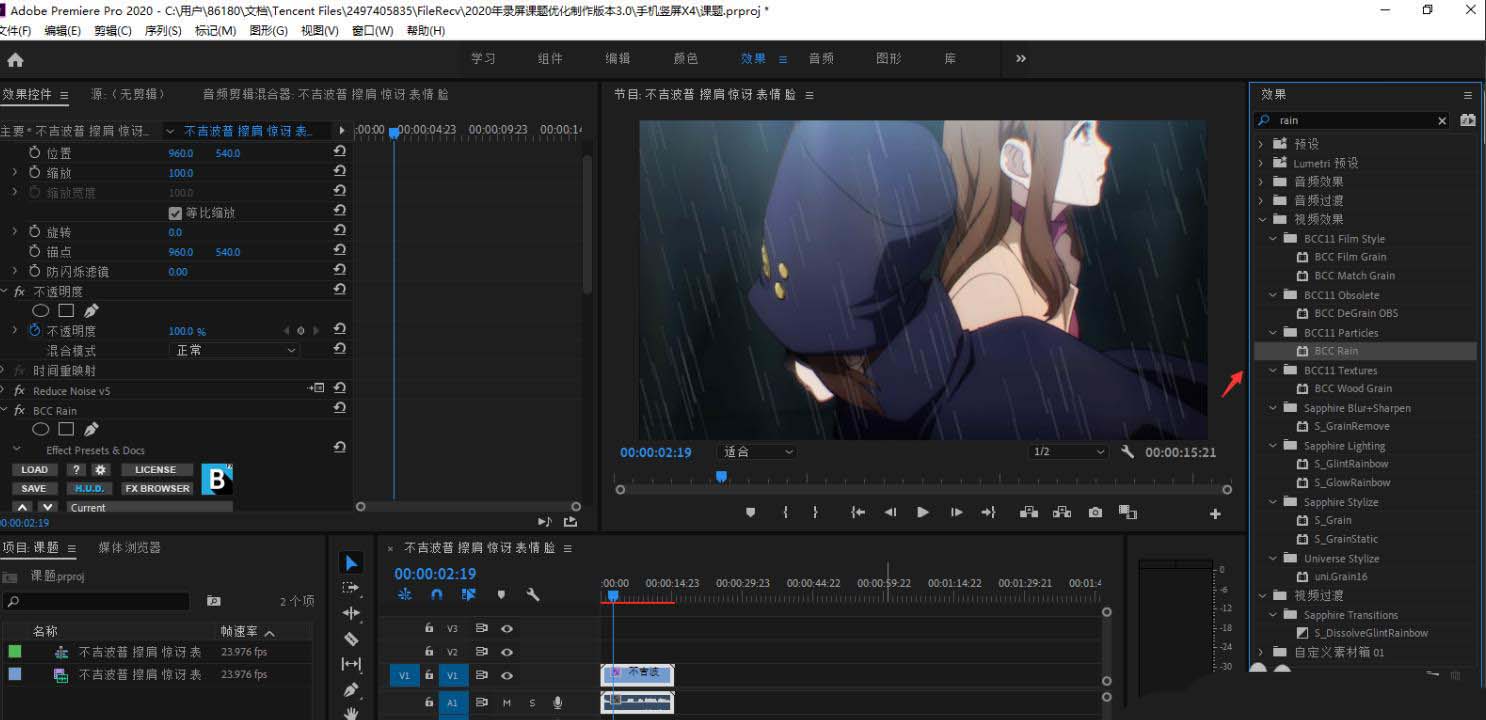 3、這時我們在效果欄搜索BCC rain,拖到素材上。(BCC插件怎么安裝? ae/pr安裝BCC插件的圖文教程)