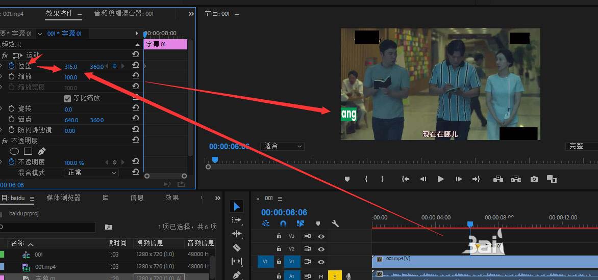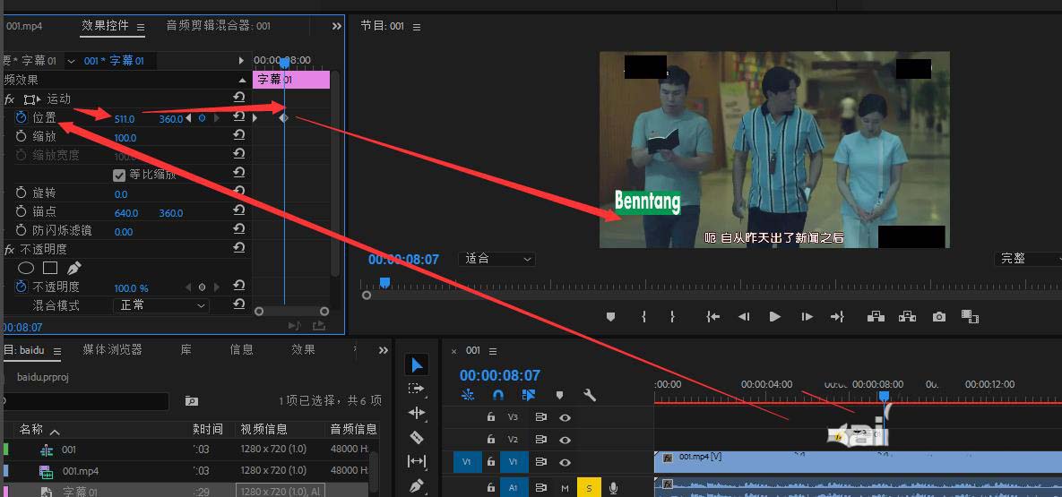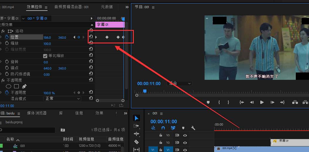1、最后在效果控件下的運(yùn)動選項中,位置移動到視頻外,并創(chuàng)建關(guān)鍵幀,如下圖所示: