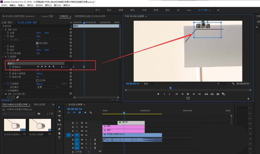 5、選中輸入的提示文字,在效果控件中為其添加一個蒙版,然后為這個蒙版路徑來設置關鍵幀動畫,讓這個文字在提示線出現之后在從無到有出現即可。