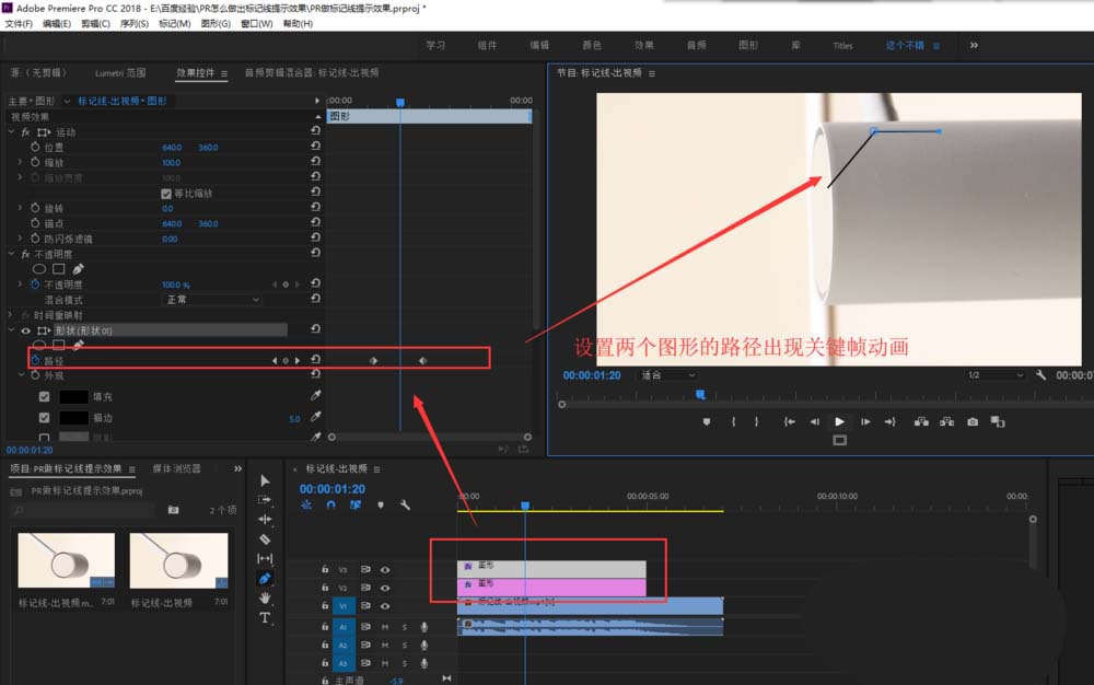 3、打開效果控件窗口,分別在效果控件中設置這兩條提示線的路徑關鍵幀動畫。讓它們從無到有出現。