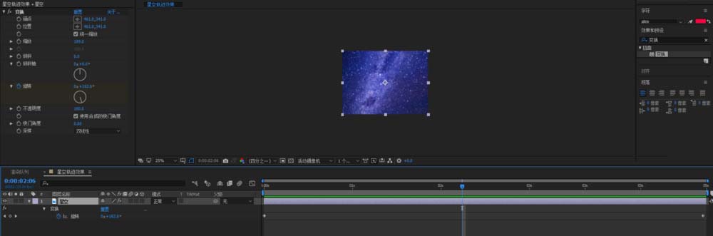 3、給星空添加變換,效果-扭曲-變換;給變換的旋轉k關鍵幀,從開始到結束,然后調整變換的縮放值,在旋轉的過程放大到整個畫布;
