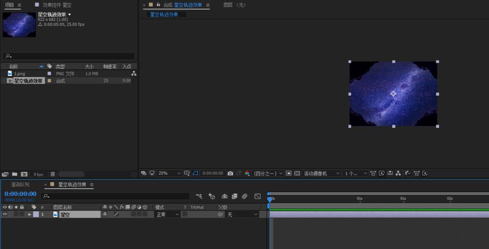 2、ctrl+i導入準備好的夜晚星空素材,并把素材圖片放入時間線面板里;