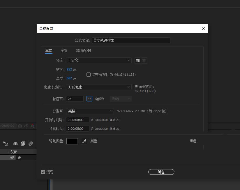 1、打開AE軟件,命名星空軌跡效果,調整相應的參數。