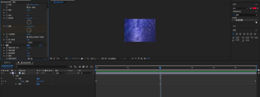 4、繼續選中星空素材添加殘影,效果-時間-殘影;調整殘影數量,將殘影運算符更改為最大值;