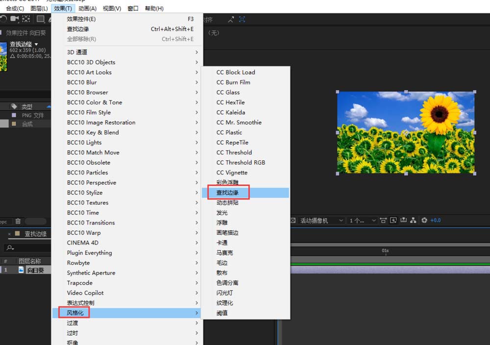 3、選中圖片素材,添加查找邊緣;效果-風格化-查找邊緣;