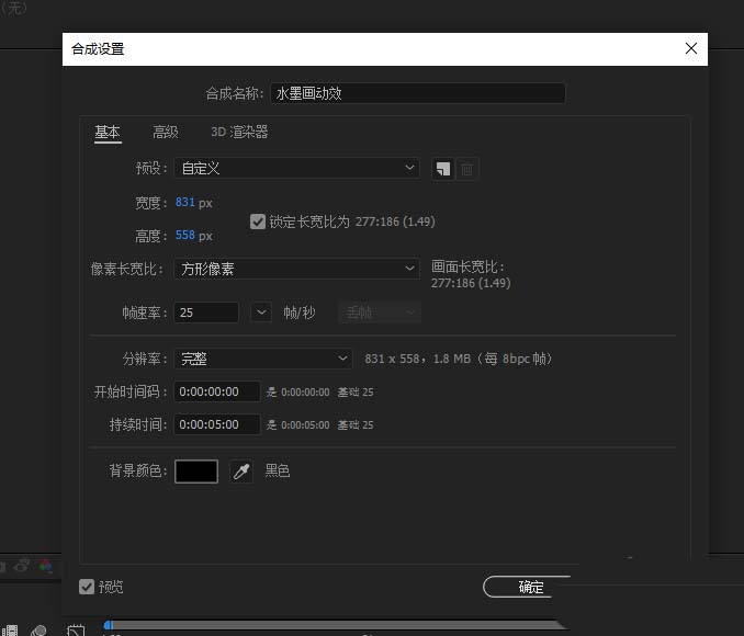 1、打開AE軟件,新建合成,命名水墨畫動(dòng)效,調(diào)整相應(yīng)的參數(shù)。