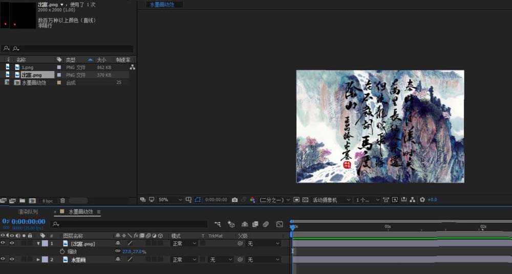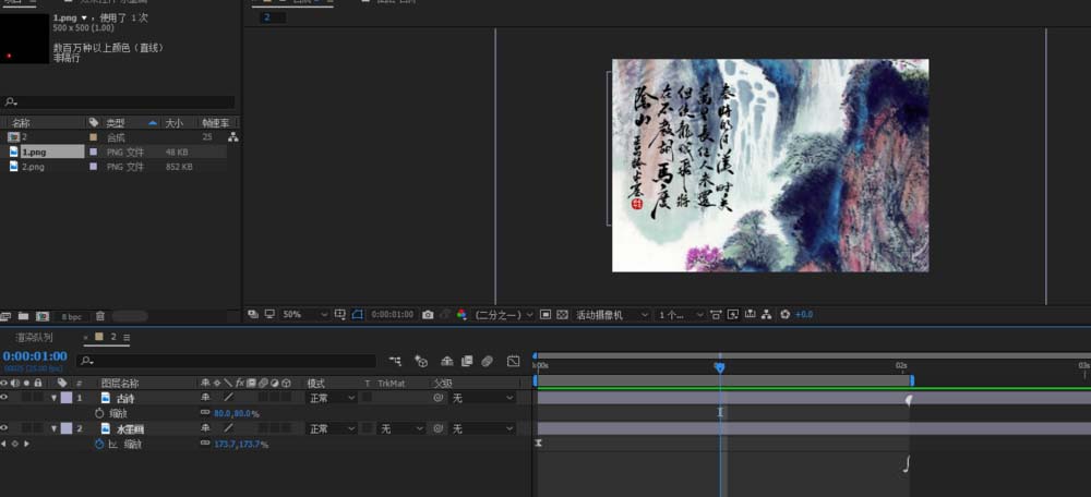 3、先給水墨畫做一個(gè)動(dòng)畫,選中水墨畫,按下s鍵給縮放k關(guān)鍵幀,實(shí)現(xiàn)背景動(dòng)畫一個(gè)鏡頭慢慢拉近的效果;調(diào)出曲線,調(diào)整節(jié)奏;