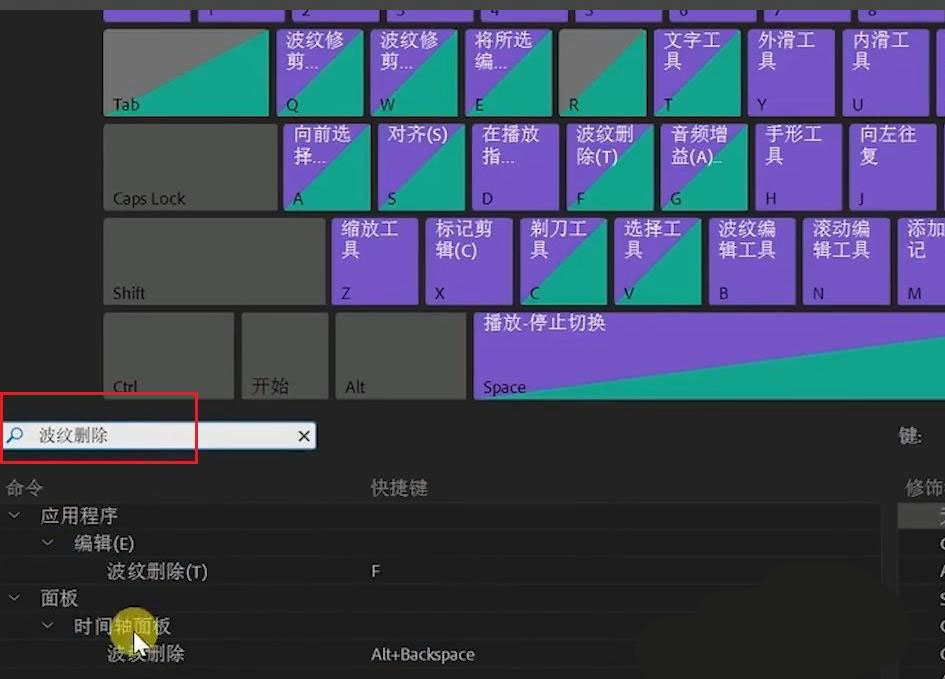 以前的時(shí)候如果我們想要?jiǎng)h除視頻中間的一段素材。那么我們需要先按delete除素材。然后再右鍵刪除空隙。這樣的話。如果剪輯的時(shí)間短。并不會(huì)覺得麻煩,但是如果你剪輯的時(shí)間很長,你就會(huì)覺得很浪費(fèi)時(shí)間,我們可以通過快捷鍵F一步到位。但是這個(gè)快捷鍵不是系統(tǒng)默認(rèn)的快捷鍵。所以我們需要自己手動(dòng)設(shè)置一下。首先我們在PR的菜單欄中選擇-編輯。然后選擇-快捷鍵。在搜索框中輸入-波紋刪除。然后我們就可以看到波紋刪除。你可以根據(jù)你自己的喜好來設(shè)置默認(rèn)的快捷鍵。