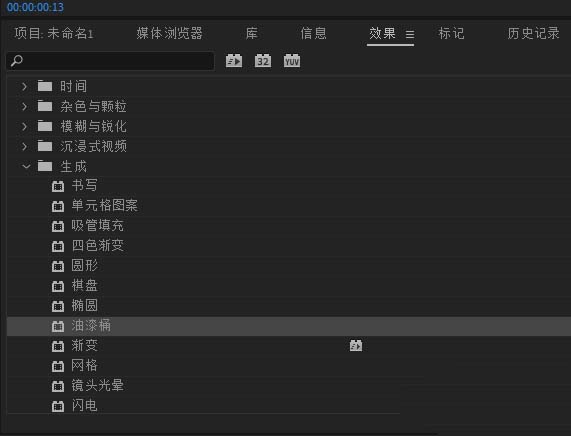 3、在效果面板搜索油漆桶,雙擊添加,或者手動拖動到序列上。