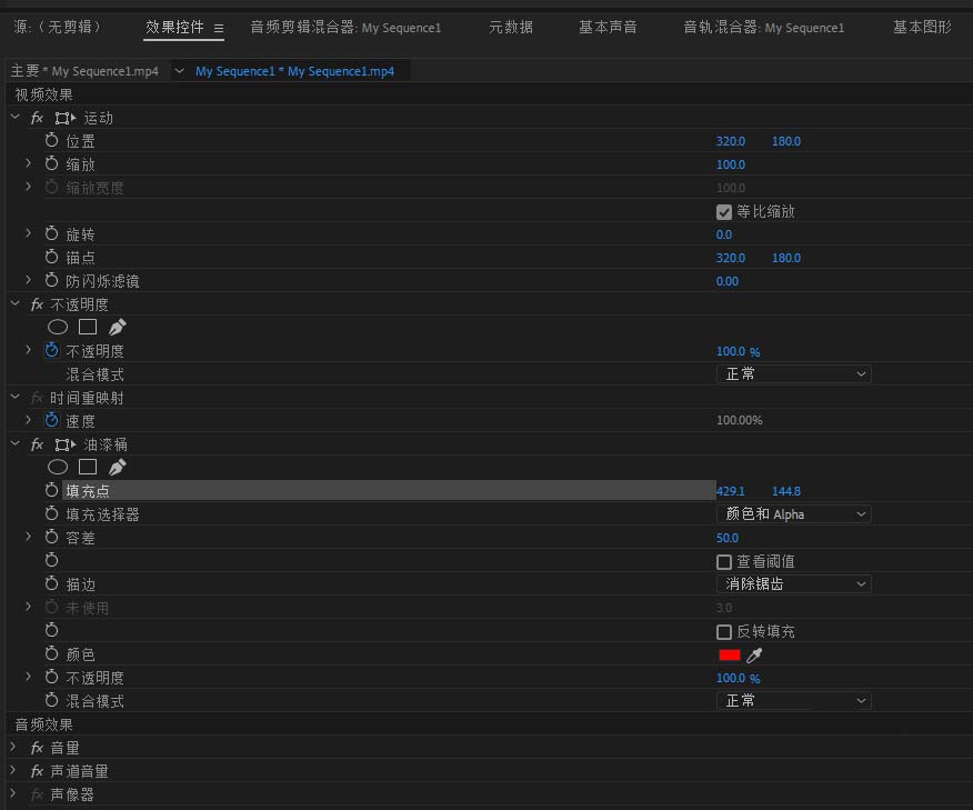 4、在效果控件面板可以編輯油漆桶效果的具體參數。