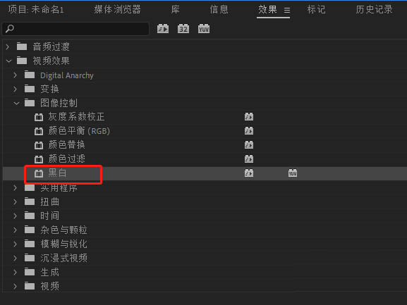 3、在效果面板搜索黑白,將效果拖動(dòng)到視頻序列上。