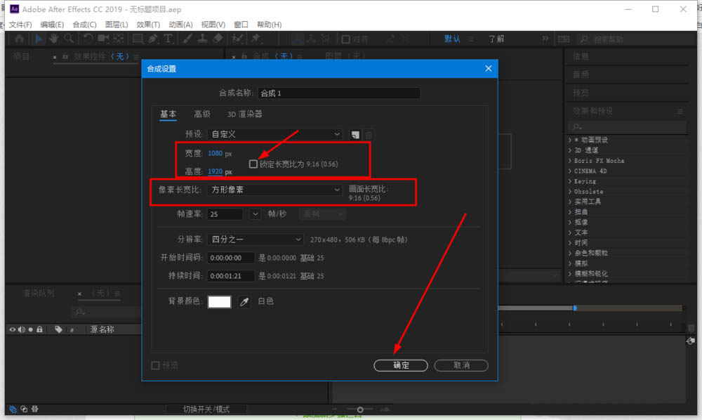 4、我們把鎖定長寬比的勾選給取消,然后寬度輸入1080,高度輸入1920,可以看到畫面長寬比位9:16了,接著點擊確定