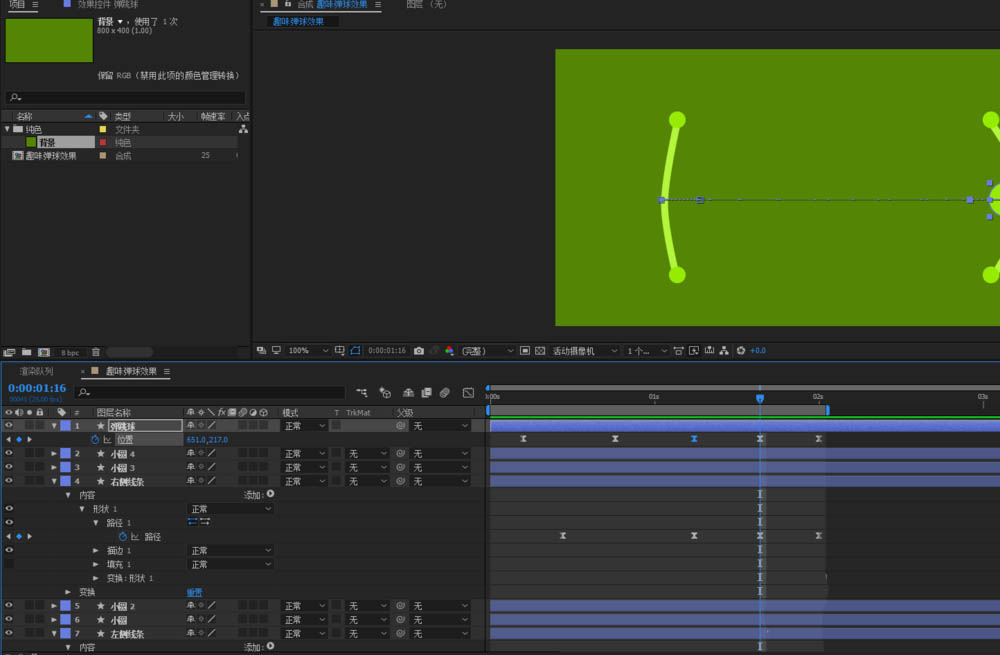7、接著再做右側的線條的一個彈簧效果 ,同樣的方法 ,在上面加一個曲柄的線,然后給它一個輔助的一個弧線 ,順便也調節一下小球的一個位置 ,接下來再往右往左側調節 ,它的一個曲柄線 ,增加一個反彈力 ,然后再往右側 ,直到線條的一個彈力消失;