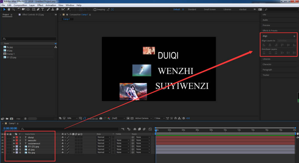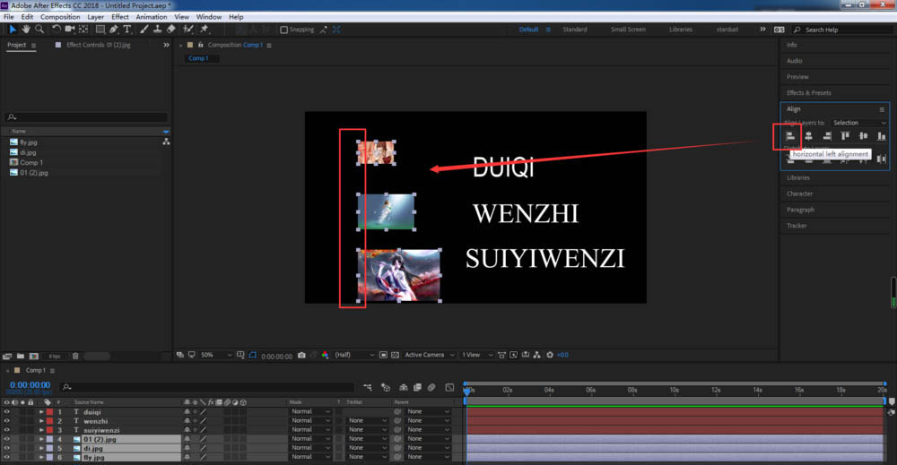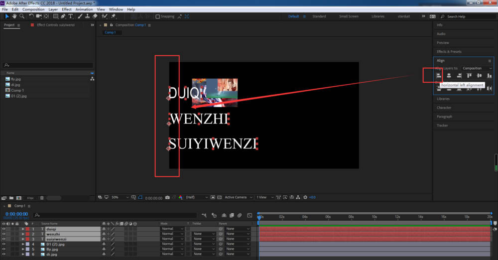 7、將對其方式改為合成之后,我們選擇文字層,點擊左對齊,可以看到文字就會以合成的左邊緣進行對齊;