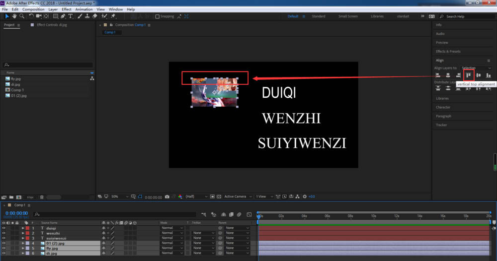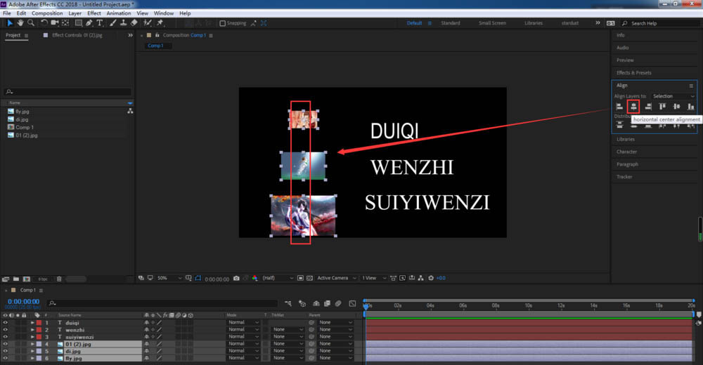 6、之前的對齊操作,都是以選擇為參考,我們可以更改對齊方式,將對齊圖層改為合成,再次進行對齊操作,就會以合成為基準對齊;