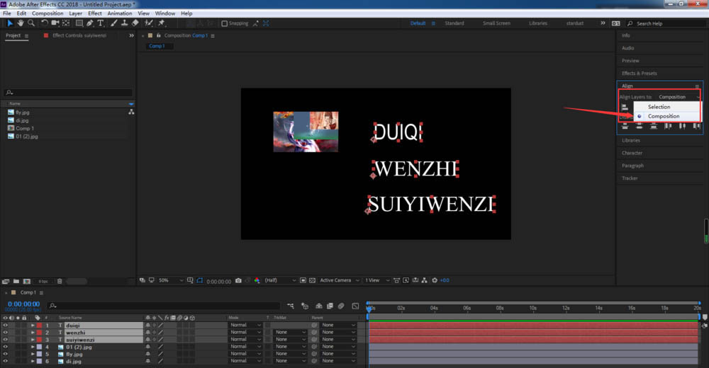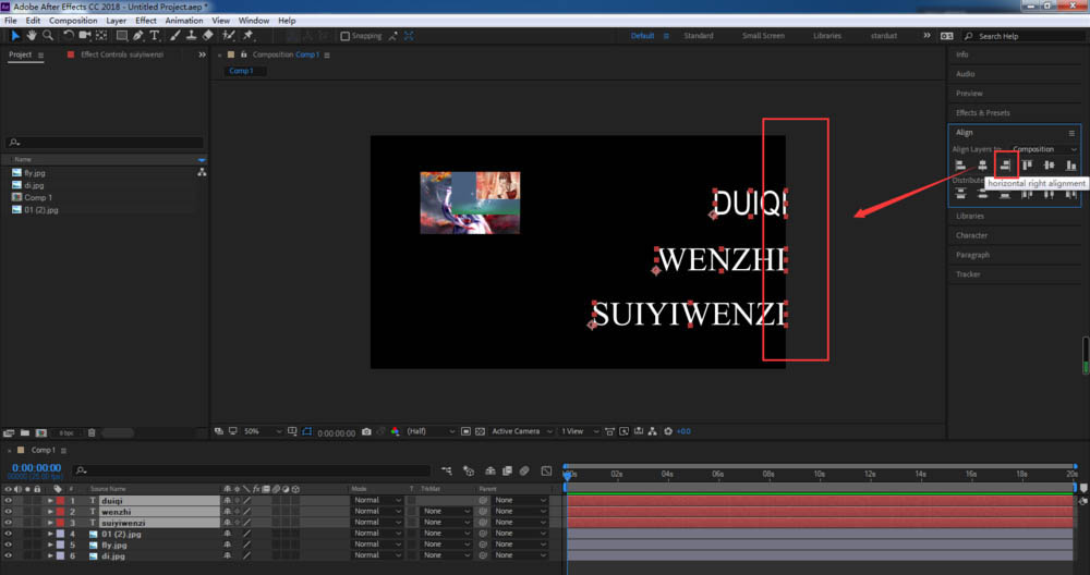8、選擇右對齊,文字圖層就會以合成的右側邊緣為基準對齊。