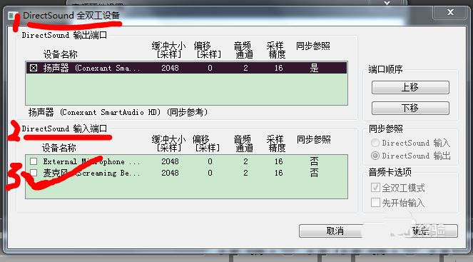 5、在“DirectSound輸入端口”的“設備名稱”中任意選擇一個,然后確定